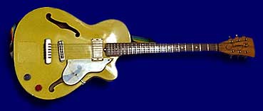 Apparently this is a 1960's Vox Tornado. Drastically modified by me and orginally bought in Zimbabwe, with a big hole cut out of the top to fit a vibrato arm! This one has lots of personality, and a solid block of oak stuck in the middle. The oak was of course a sophisticated attempt to get that 'English' rock sound, by modifying the guitar using traditional electric lute building techniques. Strangely, it never did sound much like a lute. At one point it had a DiMarzio P90 replacement pick up on it, but all it did was scream at people to leave the room, which I don't think is very English. |